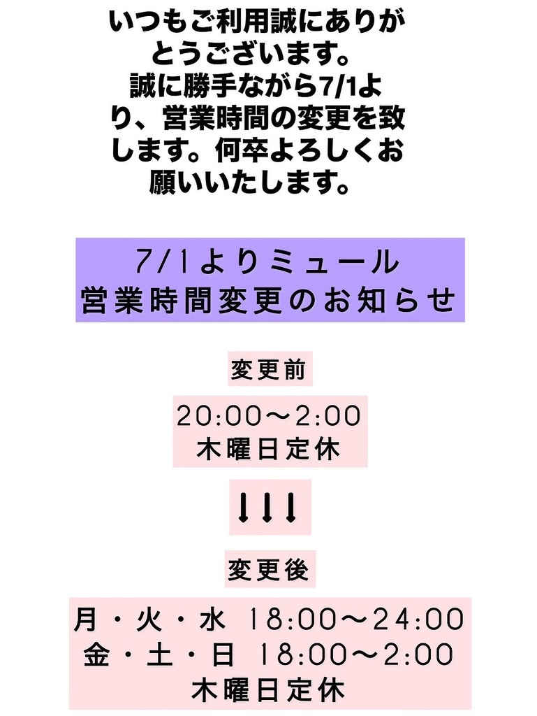 7月1日より、下記の通り営業時間が変更になります